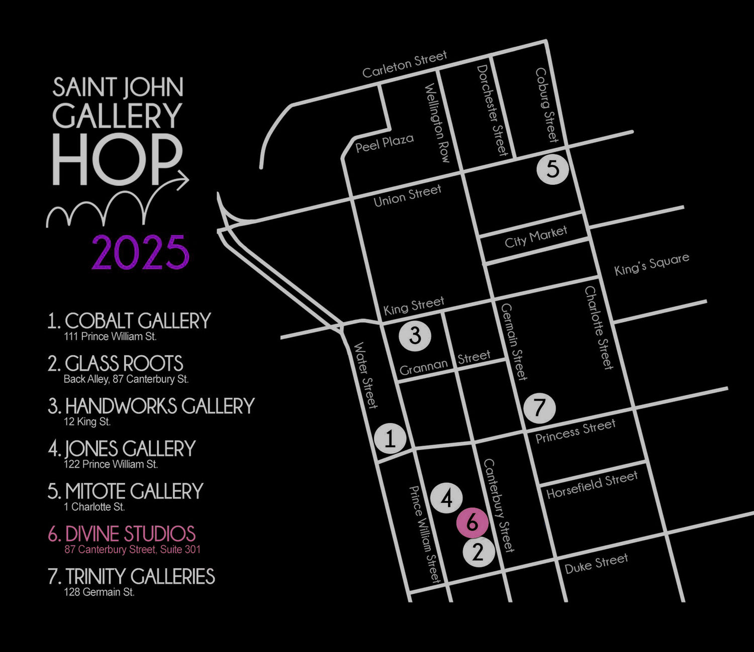 For the first time ever, Divine Studios is one of the participating Galleries in the Saint John Gallery Hop. Find us in the same building as Glass Roots Glass Blowing Studio, enter through the front door and head up to the loft.