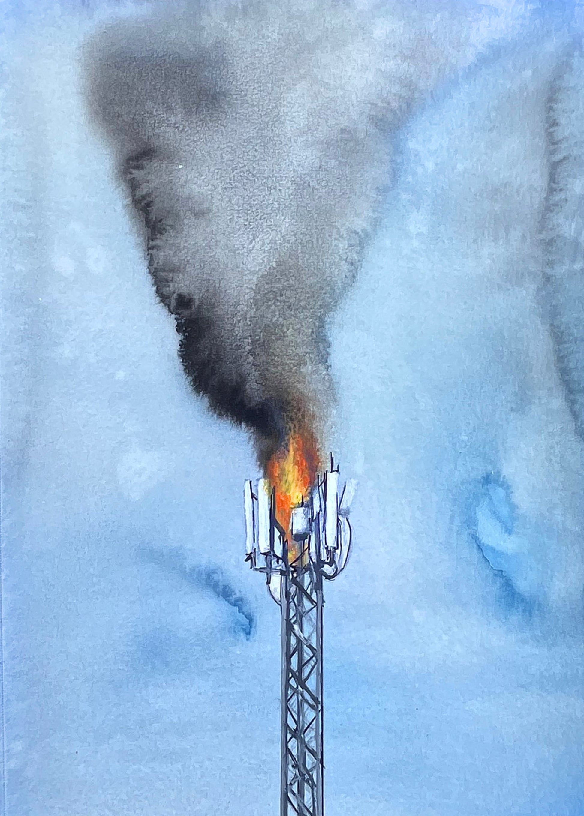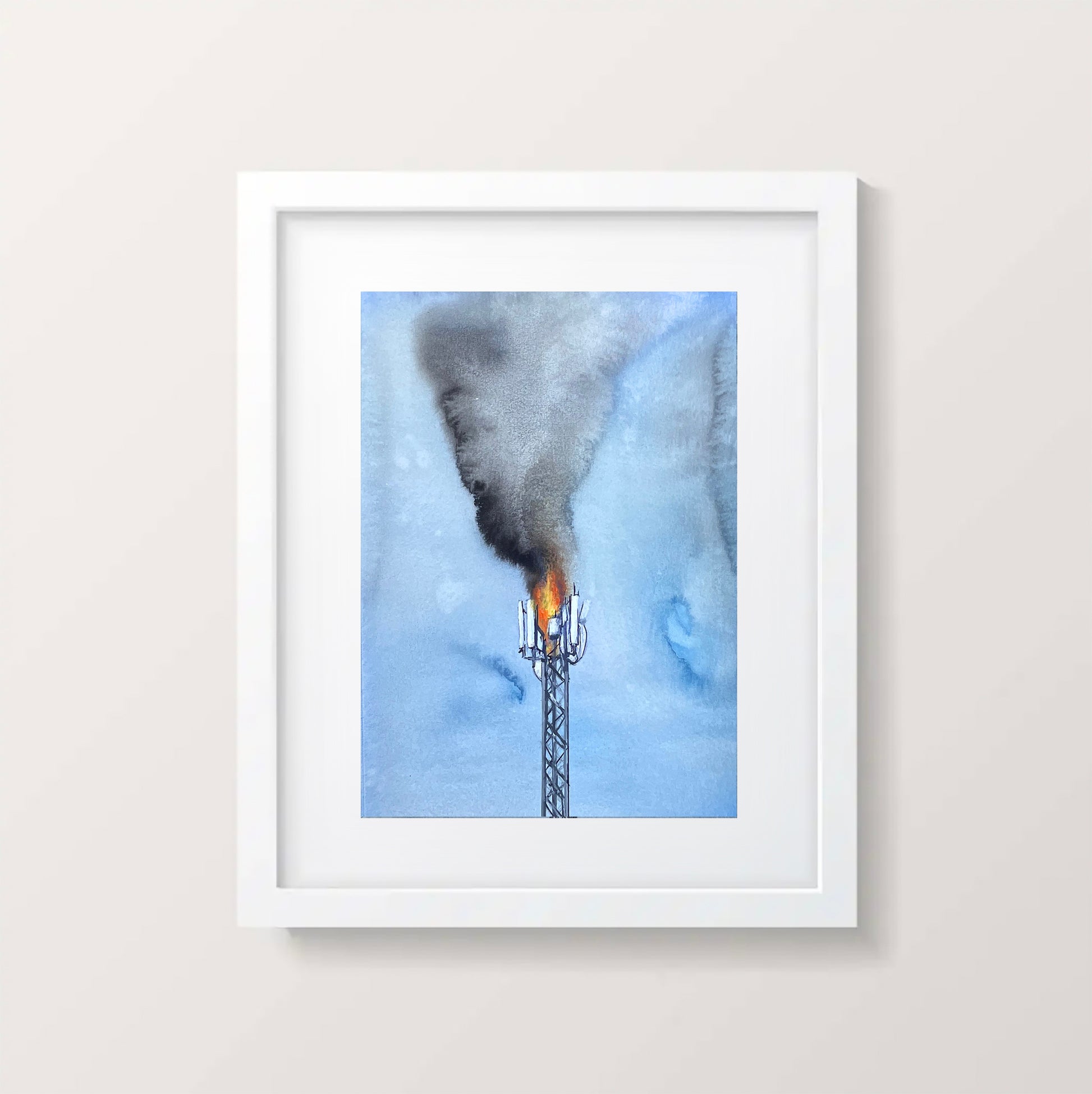 Visual Impact, Fiery, Expressive, Vibrant, 5G Radiation, Enigmatic, EMF awareness, EMF Protection, Modern Art Collections, Statement Pieces, Unique Home Decor, Modern contemporary art, original hand painted Original Art, Cell Tower, On Fire, Protest Art, Art Activism, EMF protest, anti-5G, Watercolor, Abstract, Flaming, Bold Colors, Dynamic, Moody, Surreal, Dramatic, Intense, Contrasting