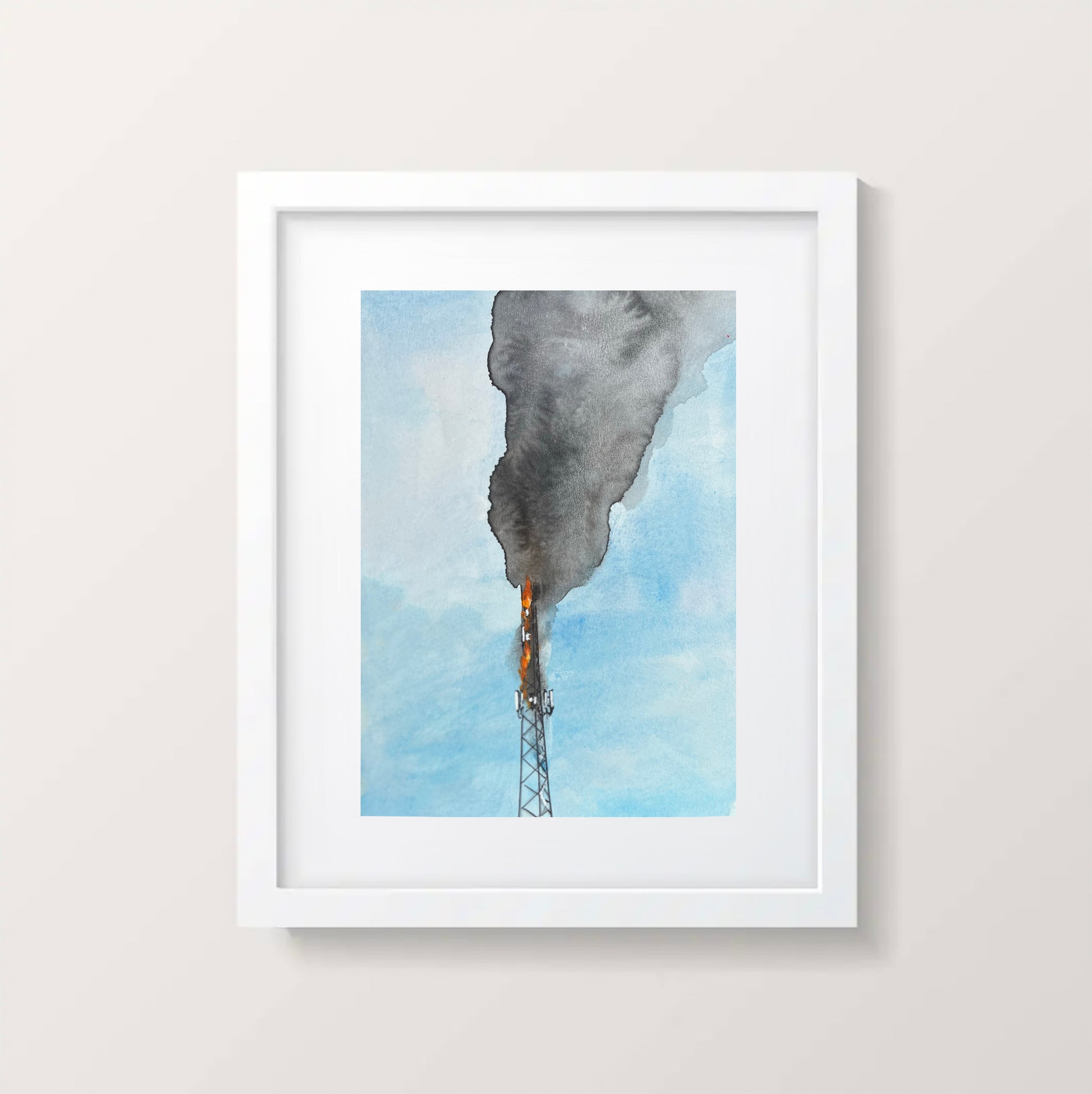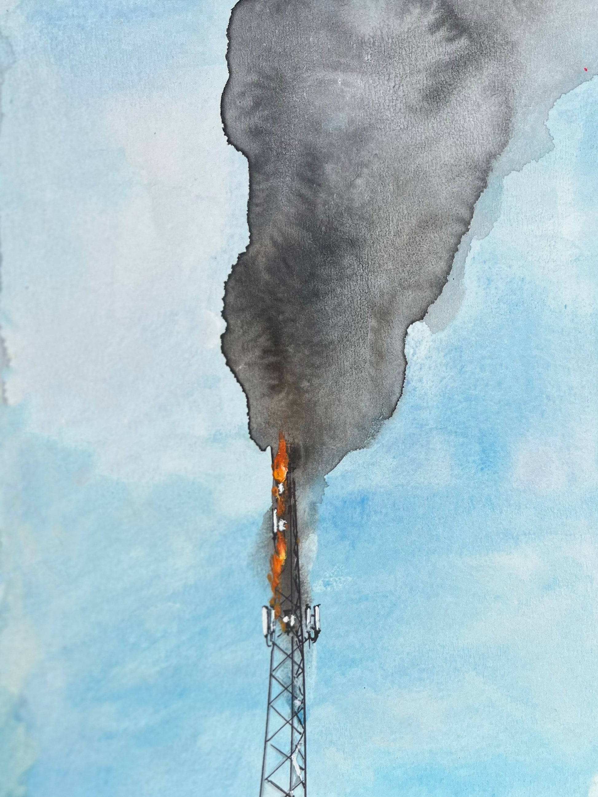 Visual Impact, Fiery, Expressive, Artistic, Vibrant, Emotional, Enigmatic, Modern Art Collections, Statement Pieces, Unique Home Decor, Modern contemporary art, original hand painted Original Art, Cell Tower, On Fire, Watercolor, Abstract, Flaming, Bold Colors, Dynamic, Moody, Surreal, Dramatic, Intense, Contrasting