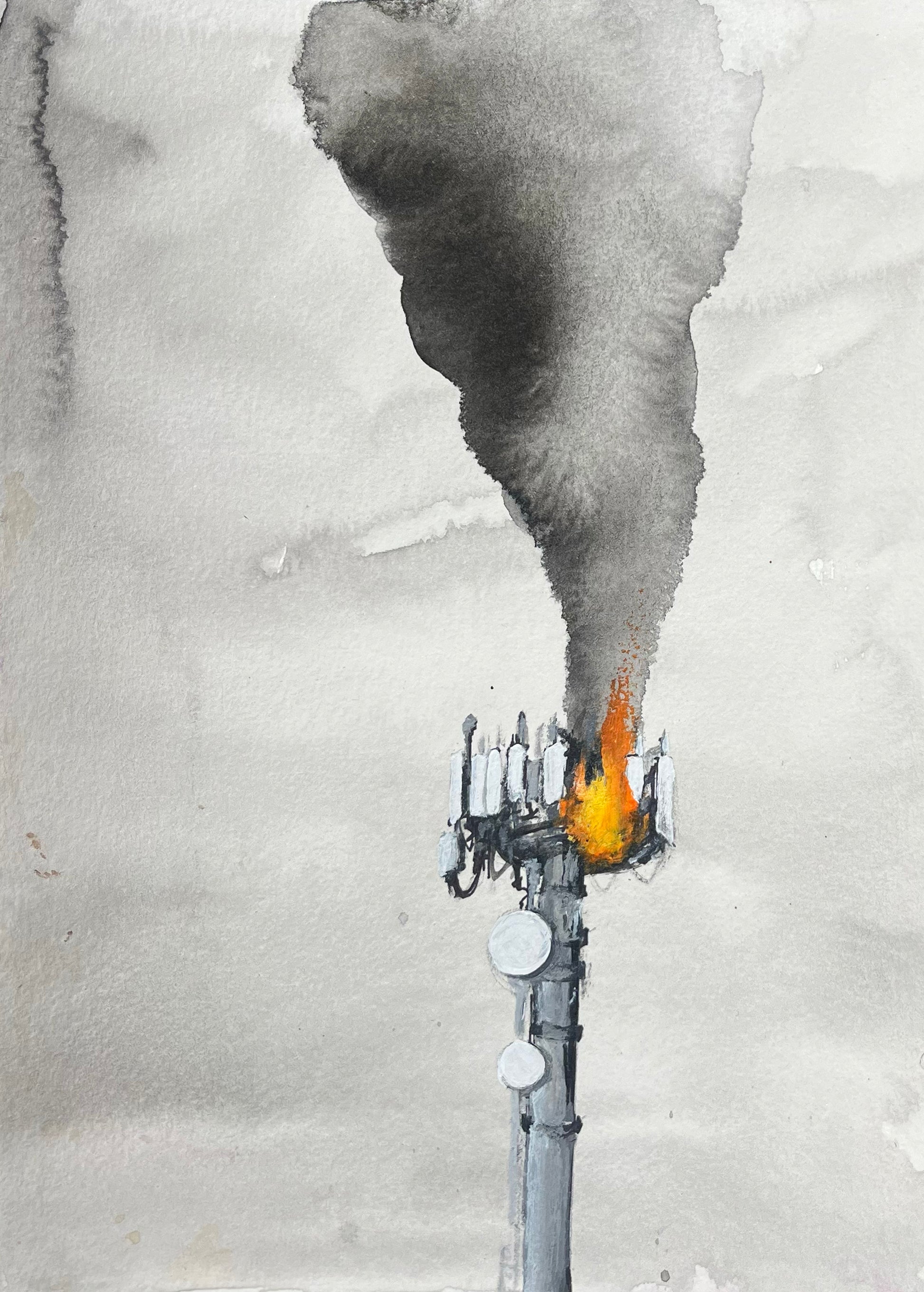 Visual Impact, Fiery, Expressive, Vibrant, 5G Radiation, Enigmatic, EMF awareness, EMF Protection, Modern Art Collections, Statement Pieces, Unique Home Decor, Modern contemporary art, original hand painted Original Art, Cell Tower, On Fire, Protest Art, Art Activism, EMF protest, anti-5G, Watercolor, Abstract, Flaming, Bold Colors, Dynamic, Moody, Surreal, Dramatic, Intense, Contrasting