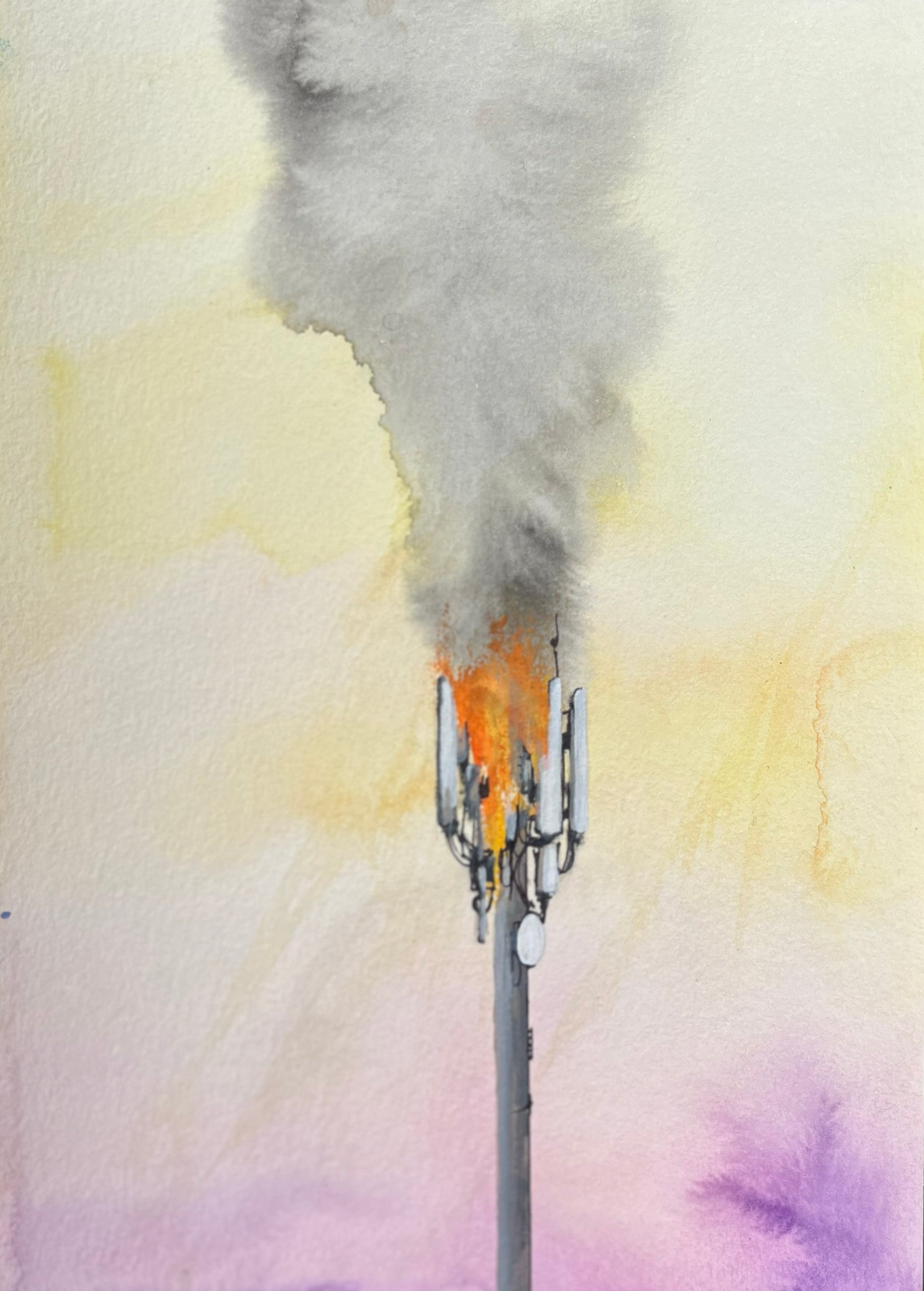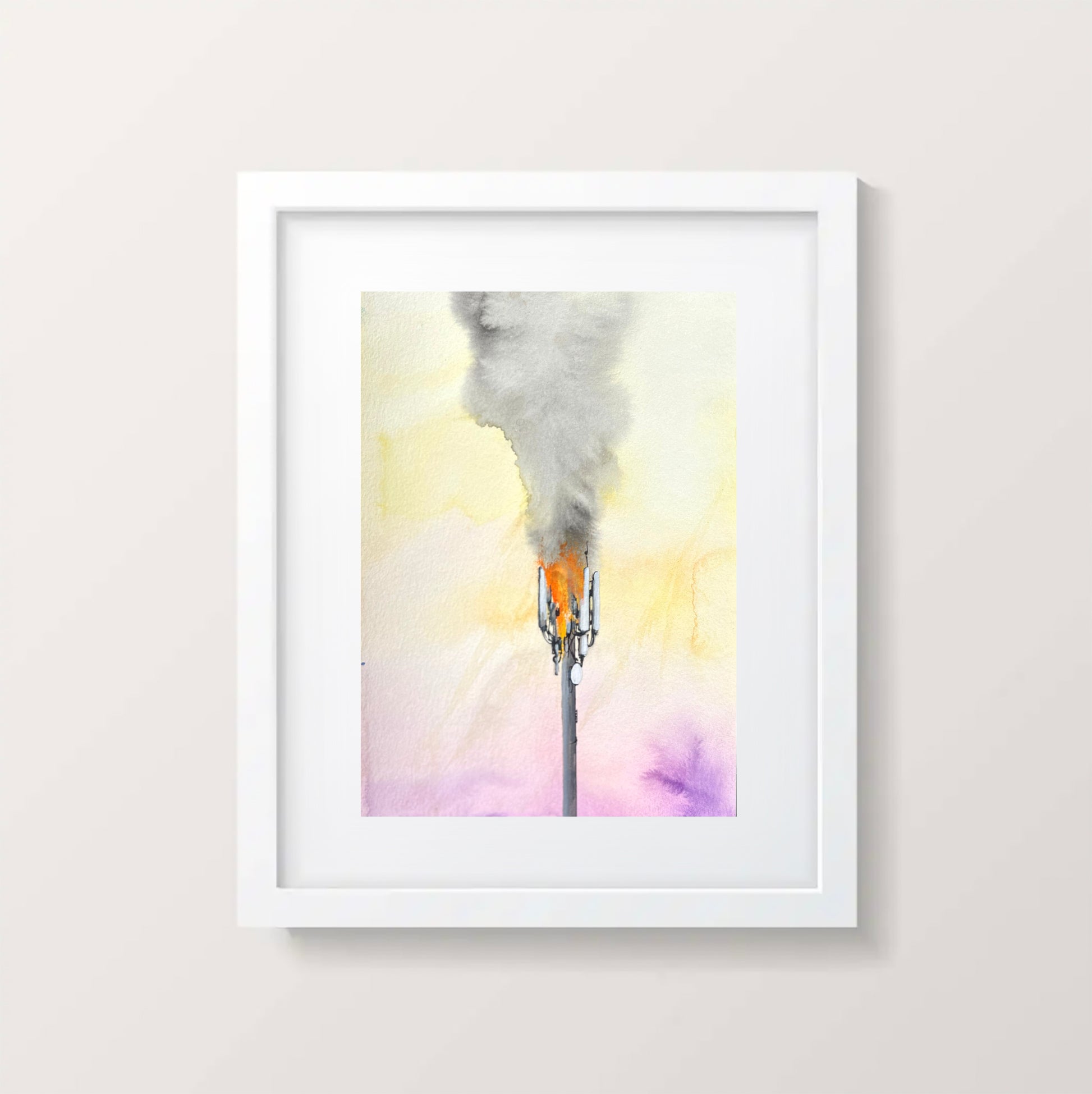 Visual Impact, Fiery, Expressive, Vibrant, 5G Radiation, Enigmatic, EMF awareness, EMF Protection, Modern Art Collections, Statement Pieces, Unique Home Decor, Modern contemporary art, original hand painted Original Art, Cell Tower, On Fire, Protest Art, Art Activism, EMF protest, anti-5G, Watercolor, Abstract, Flaming, Bold Colors, Dynamic, Moody, Surreal, Dramatic, Intense, Contrasting