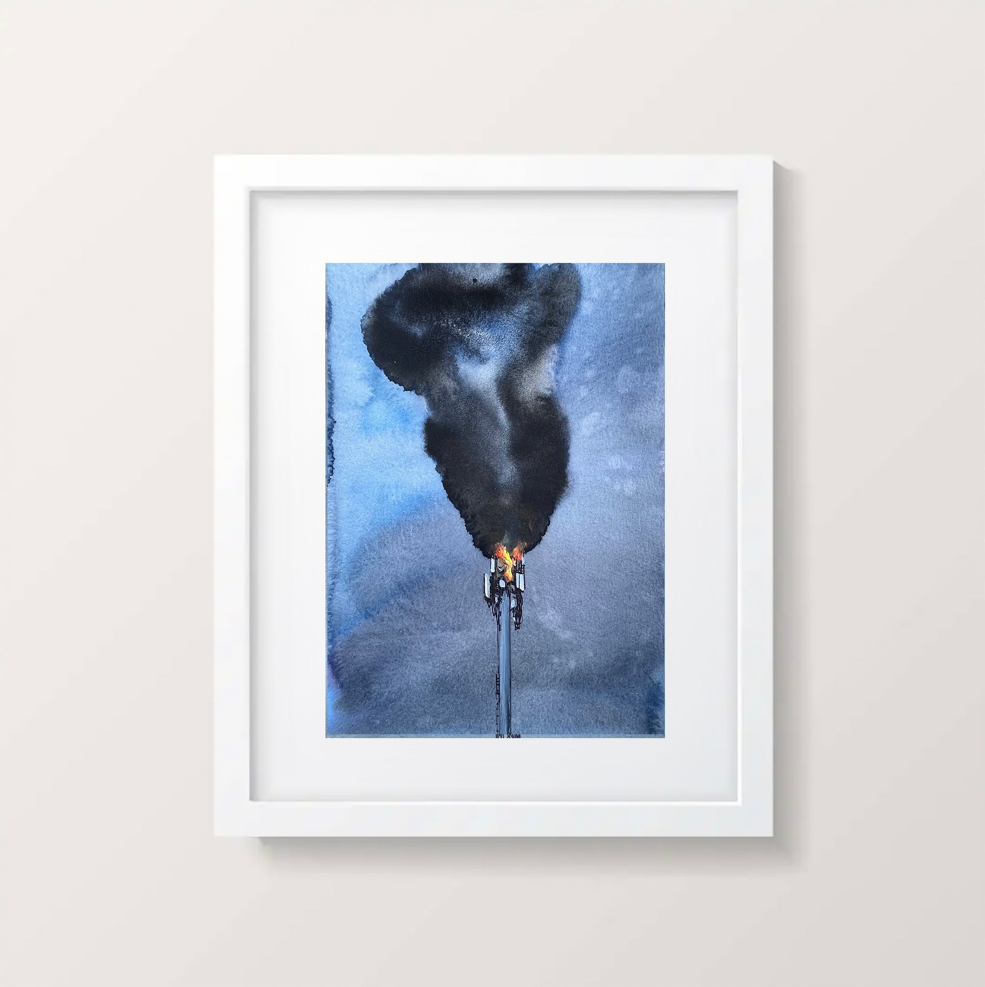 Visual Impact, Fiery, Expressive, Vibrant, 5G Radiation, Enigmatic, EMF awareness, EMF Protection, Modern Art Collections, Statement Pieces, Unique Home Decor, Modern contemporary art, original hand painted Original Art, Cell Tower, On Fire, Protest Art, Art Activism, EMF protest, anti-5G, Watercolor, Abstract, Flaming, Bold Colors, Dynamic, Moody, Surreal, Dramatic, Intense, Contrasting
