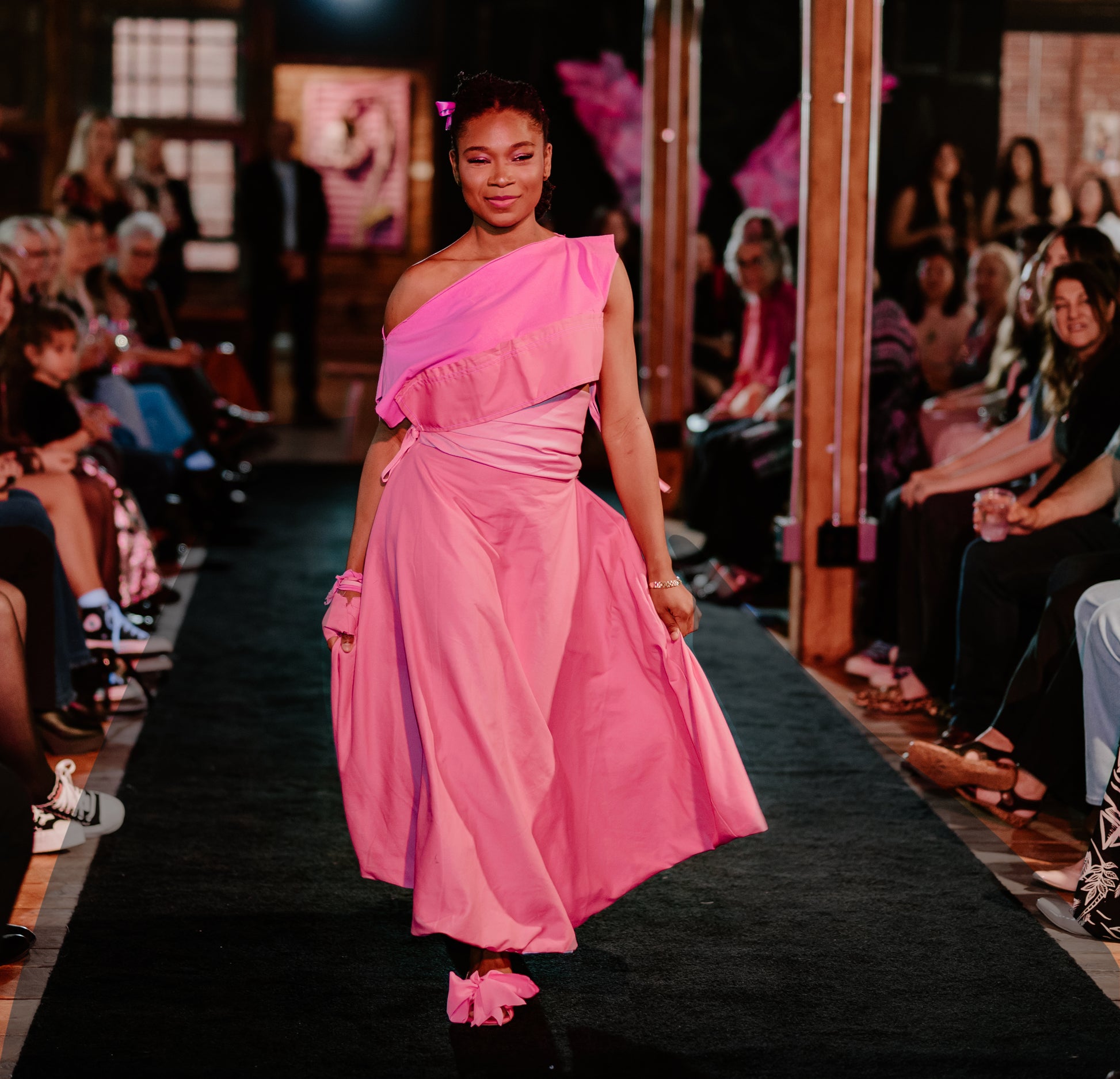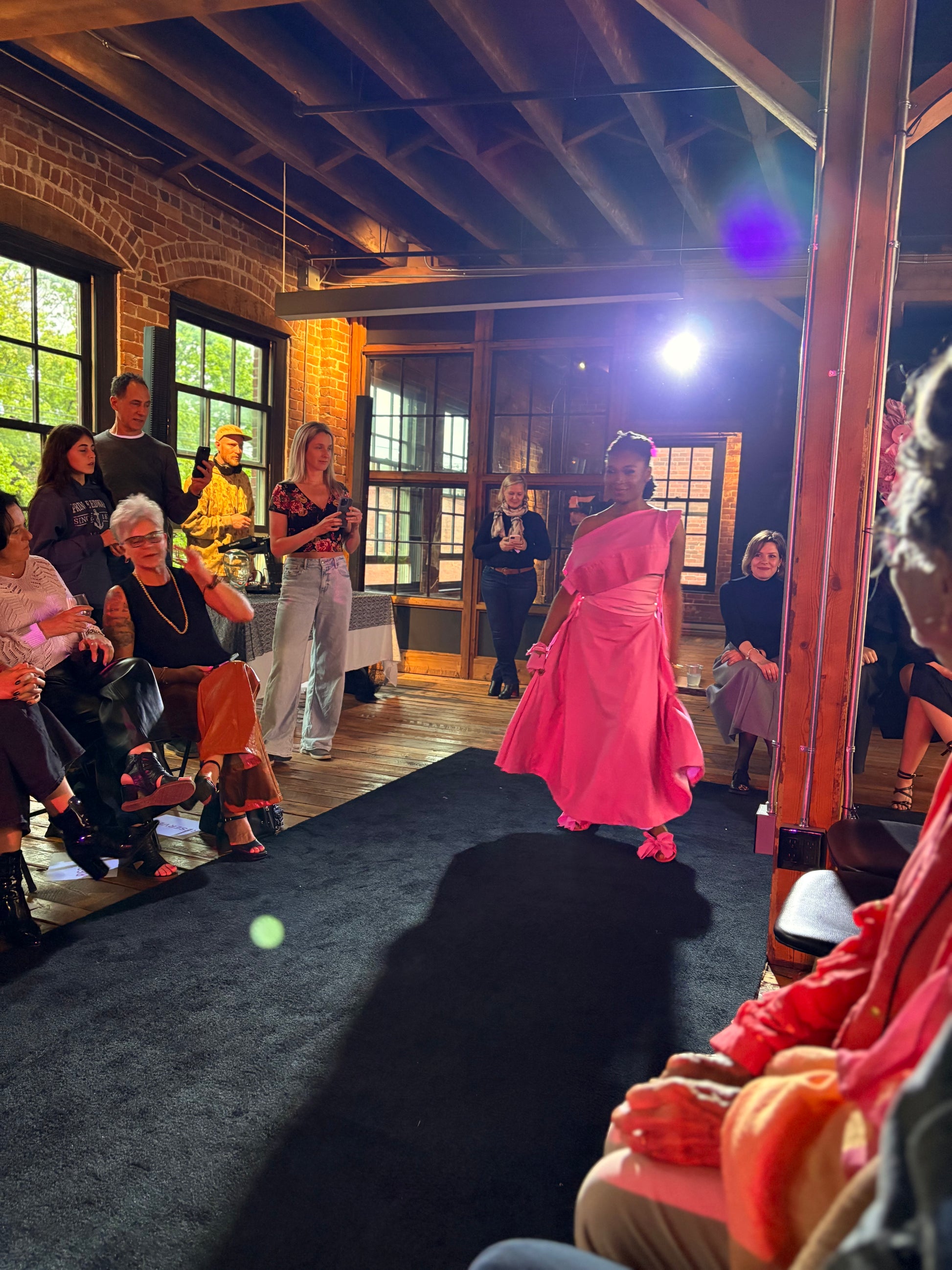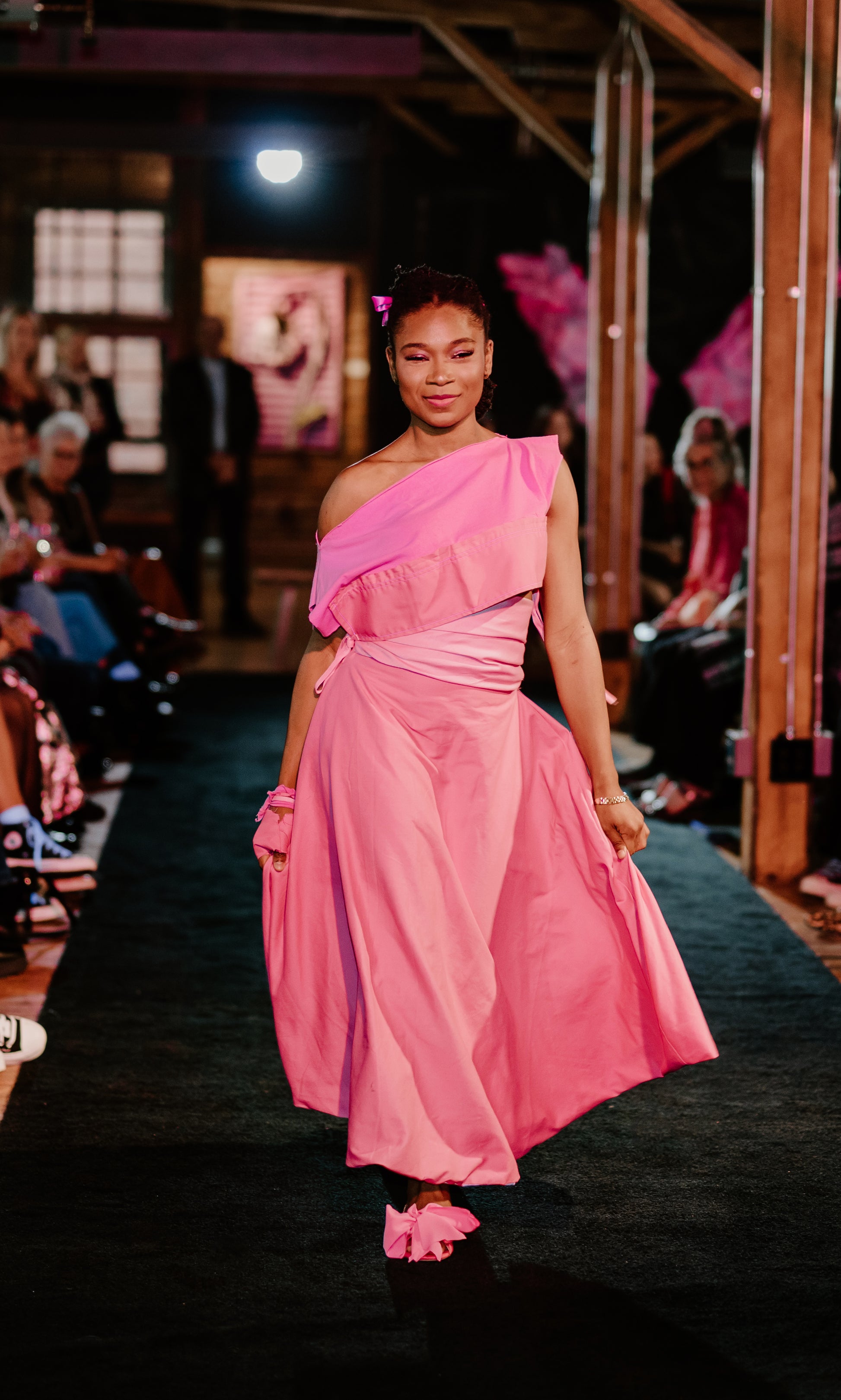 A sculpted high-rise circle skirt in rose pink paired with a structured boatneck top — crafted from reclaimed Ralph Lauren table linen. waist band is made from scraps of silky satin. flowy, romantic one of a kind set.