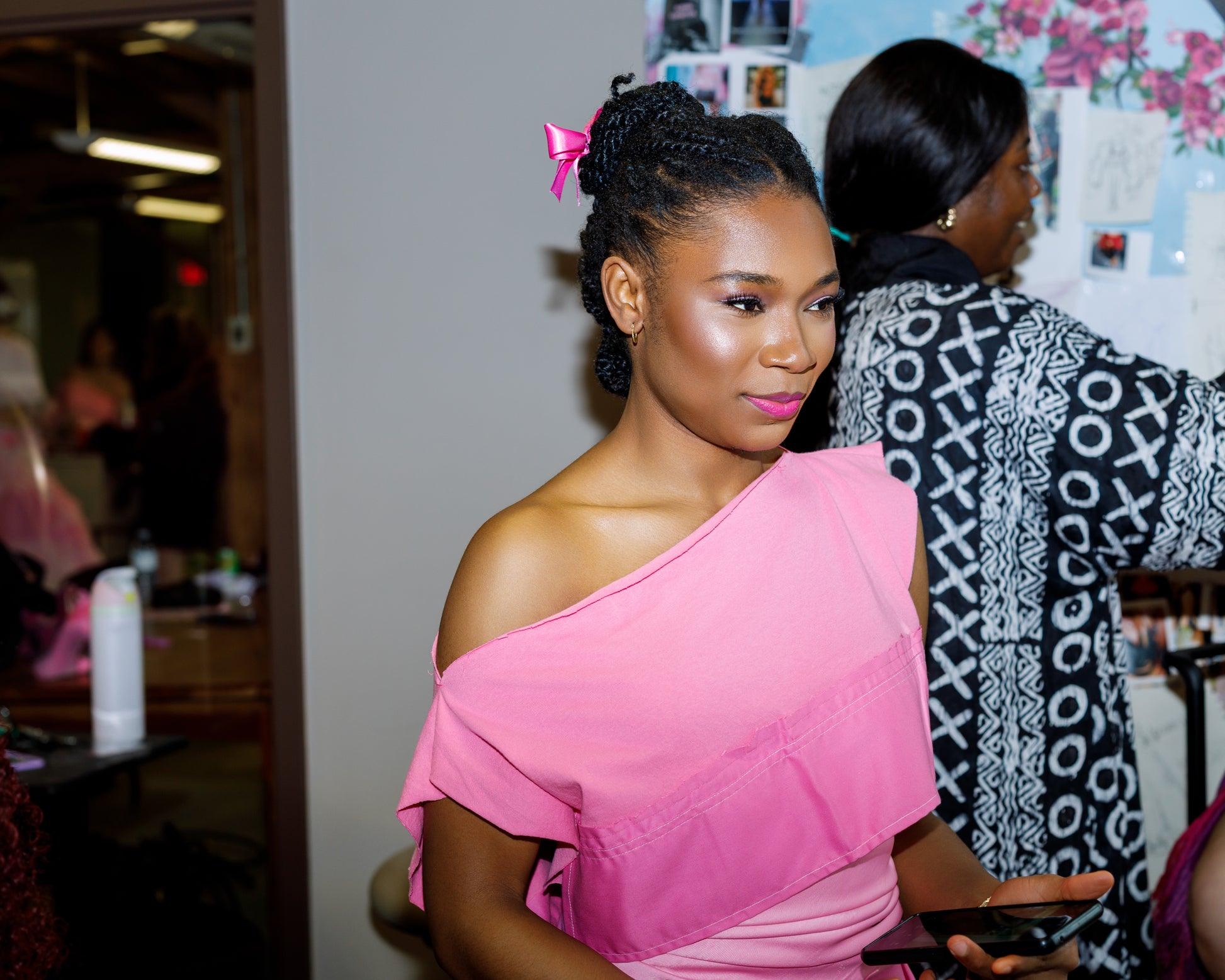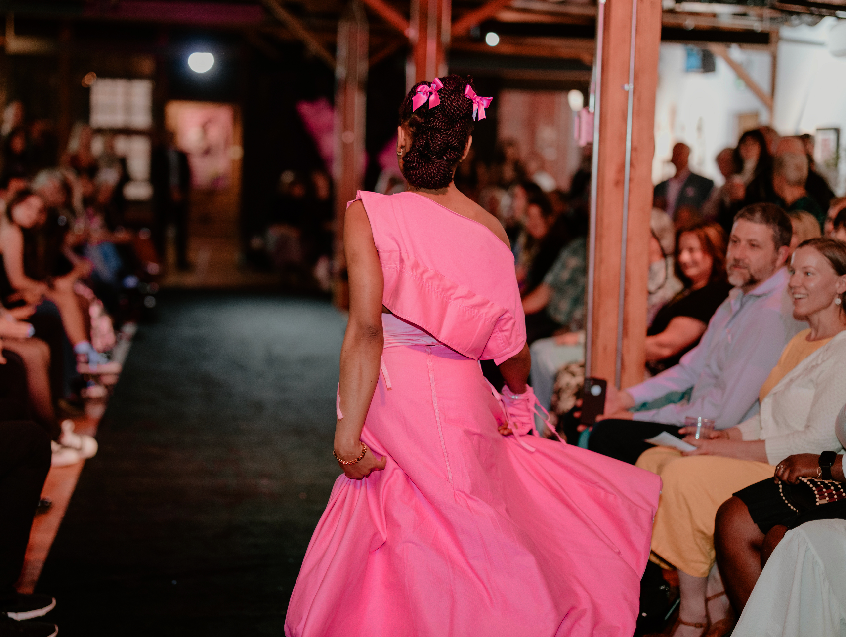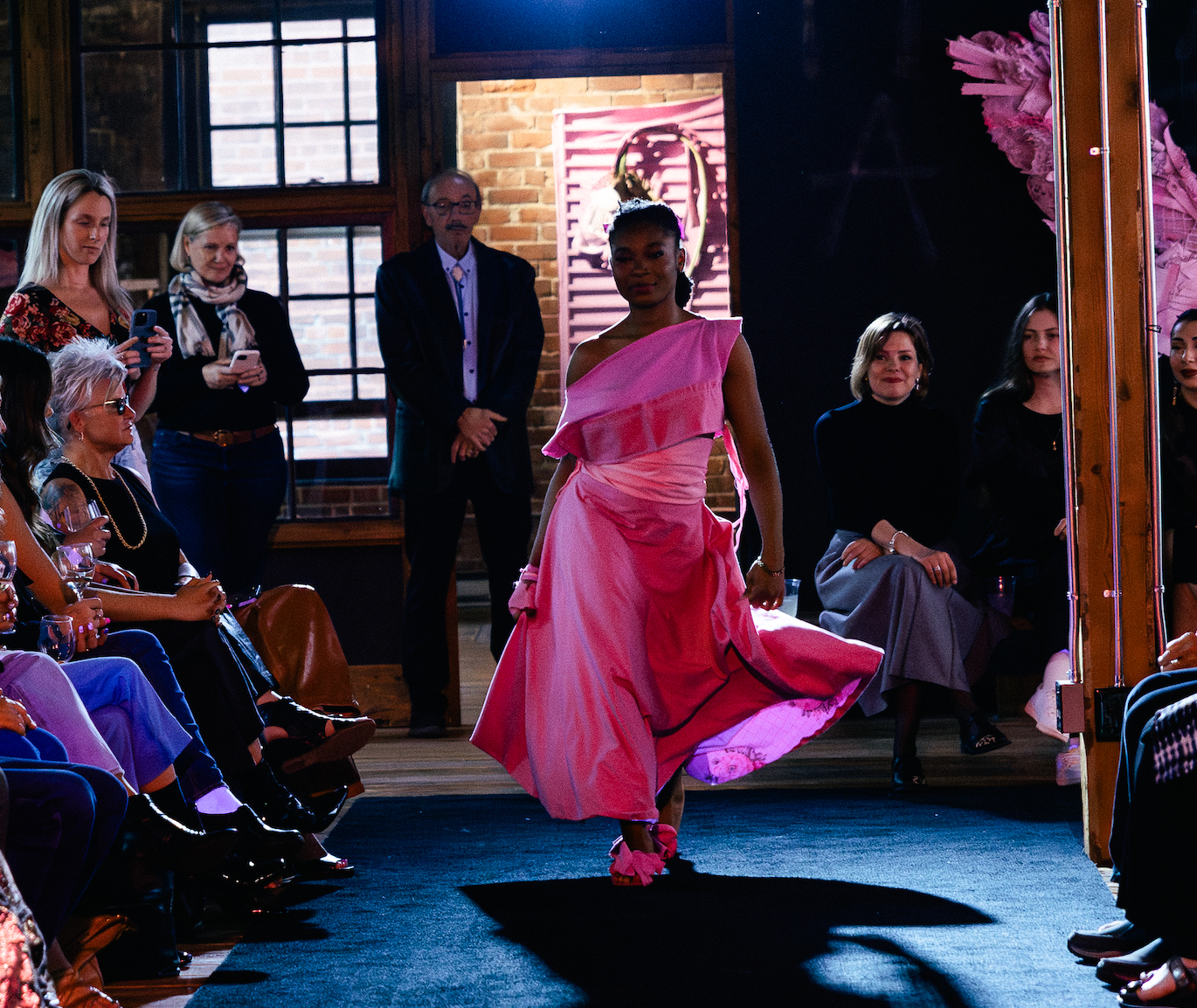 A sculpted high-rise circle skirt in rose pink paired with a structured boatneck top — crafted from reclaimed Ralph Lauren table linen. waist band is made from scraps of silky satin. flowy, romantic one of a kind set.