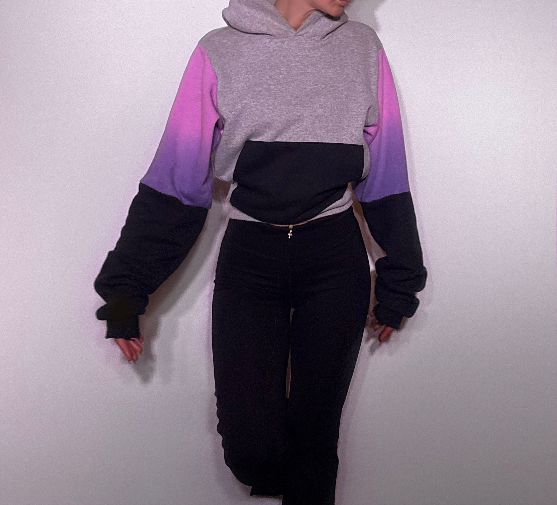 Made from a upcycled/reworked cotton fleece Champion sweatshirts and joggers, with panels of heather grey, tie-dye pink and purple, and solid black. Exaggerated long sleeves and oversized front pocket.