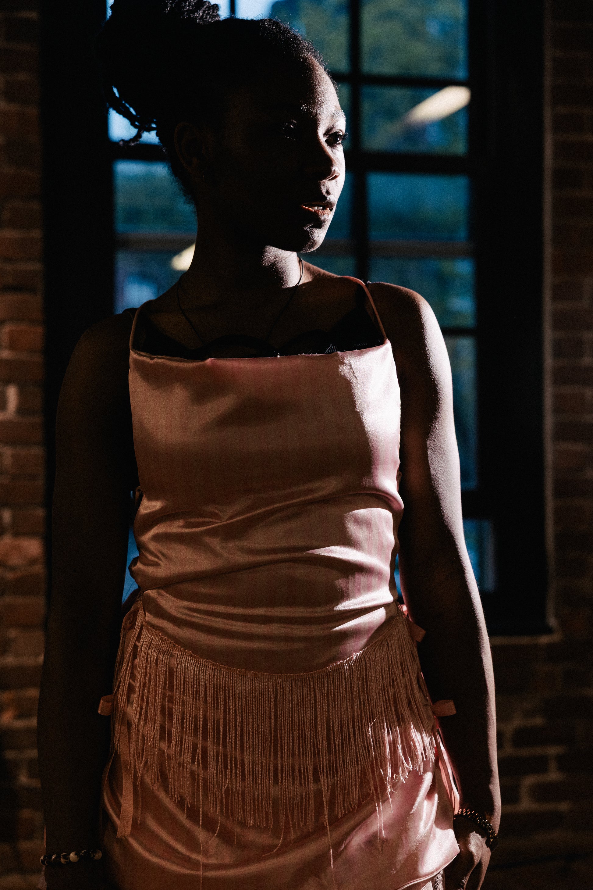 Short halter dress made from silky pink satin material. Features a cinched waist with fit + flare style silhouette. Low open back with adjustable corset-style lacing. Lace details under the skirt are crafted from vintage lace curtains and repurposed materials. Comes with matching arm cuffs for a complete look.