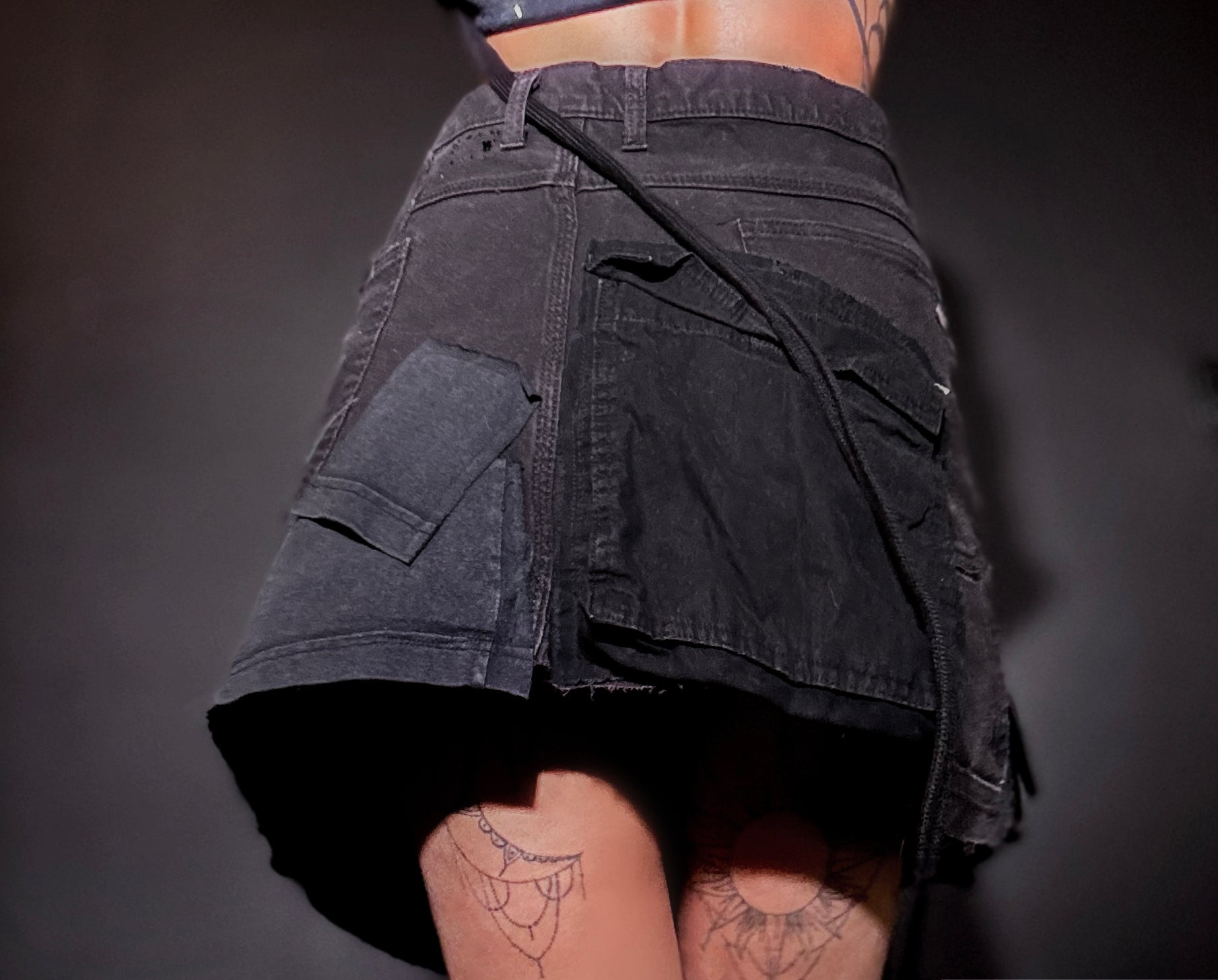 Made from rugged Dickie's heavyweight cotton black wash denim with added pockets and scrap details, this one-of-a-kind cargo wrap skirt blends utility and edge. Features an asymmetrical waistline, reinforced seams, raw edges, sizing varies.