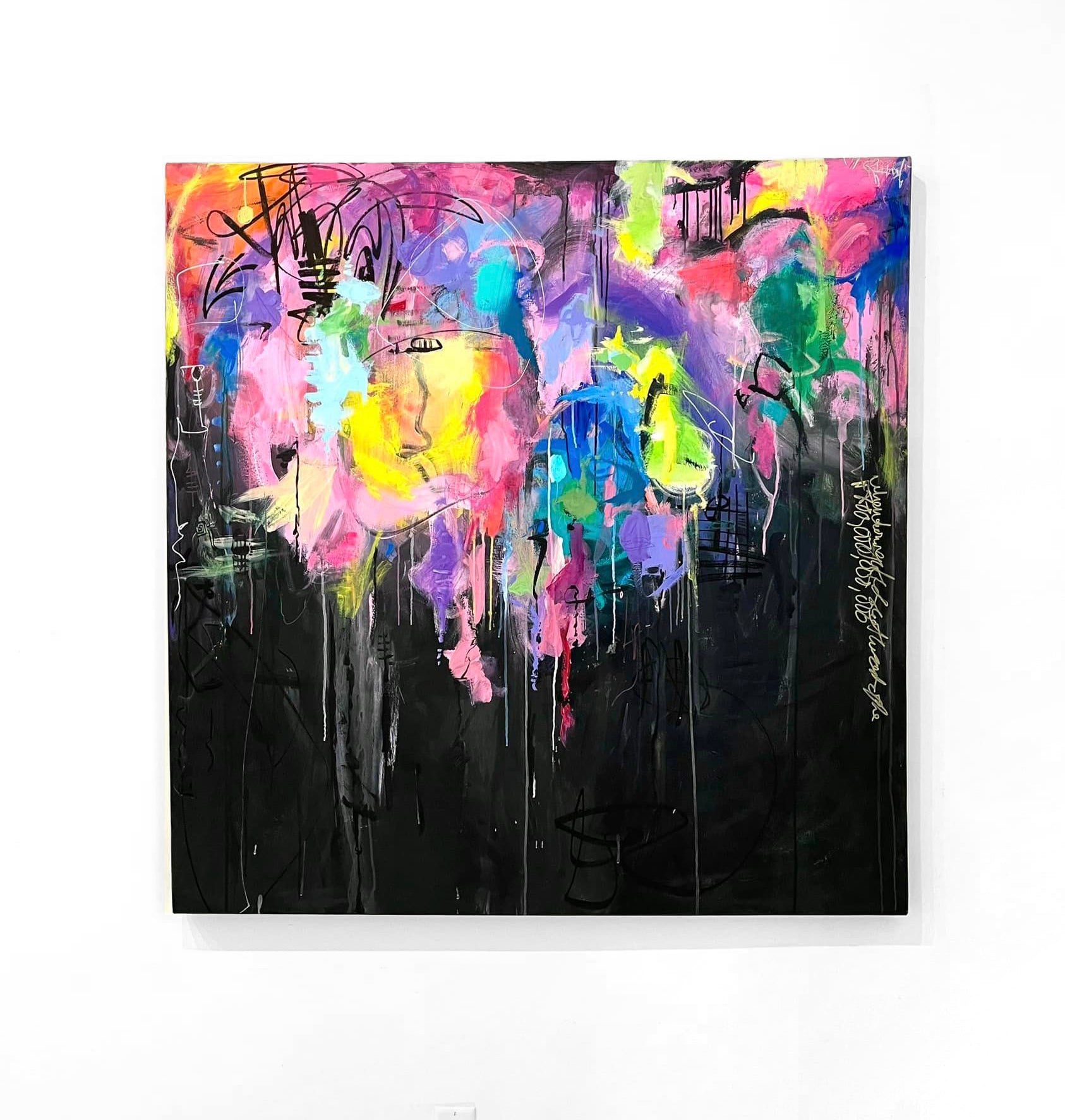 Original oversized abstract painting by Abigail Reinhart Mixed media: acrylic paint, india ink, spray paint, oil pastels on hand stretched canvas. Unique, one of a kind artwork.