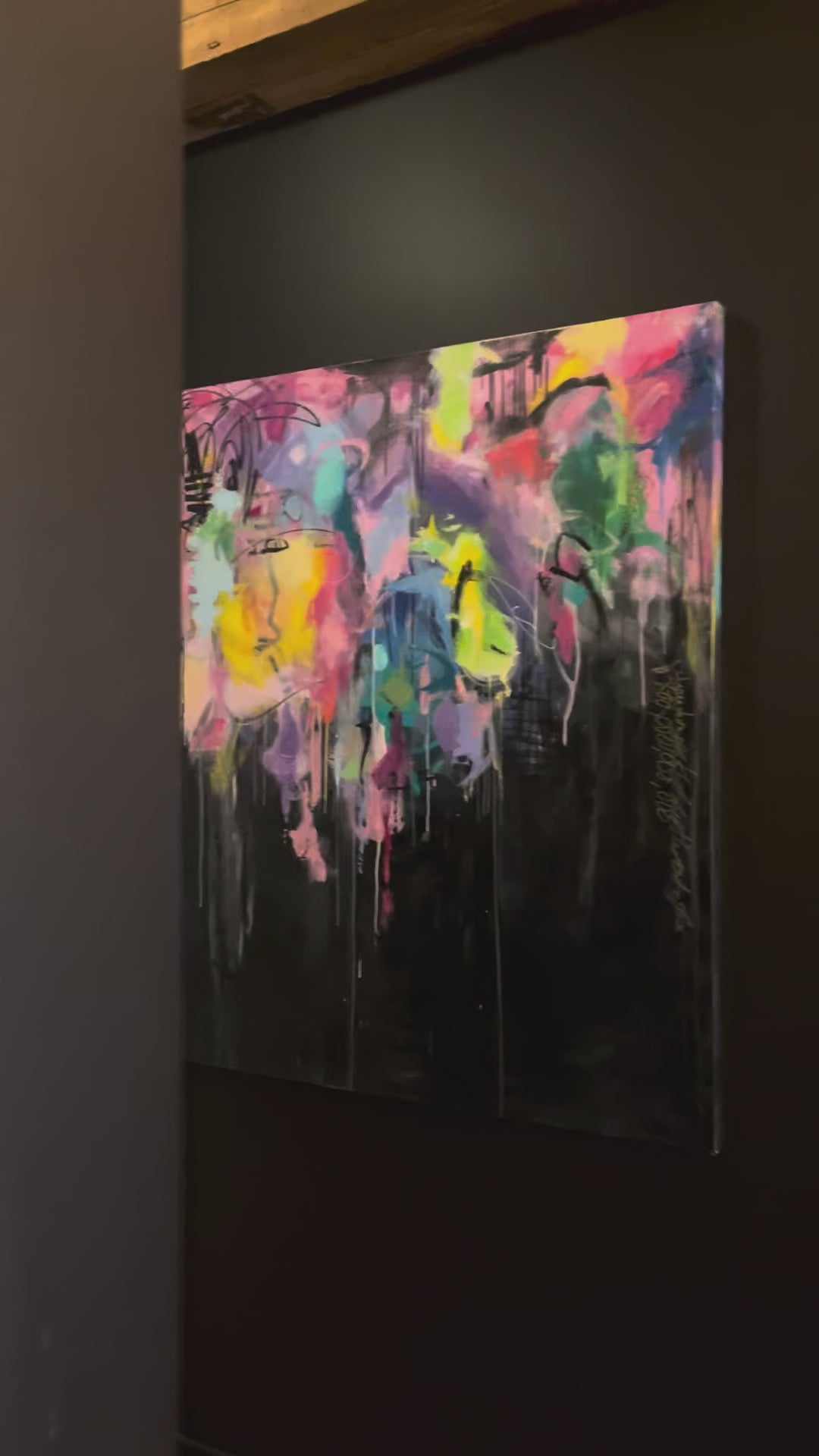 Painting is stretched onto a custom size hand made thick wooden frame.