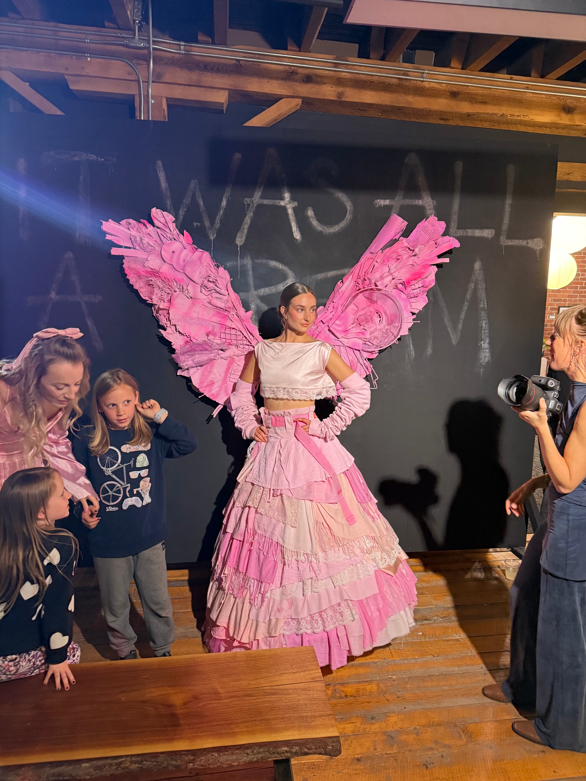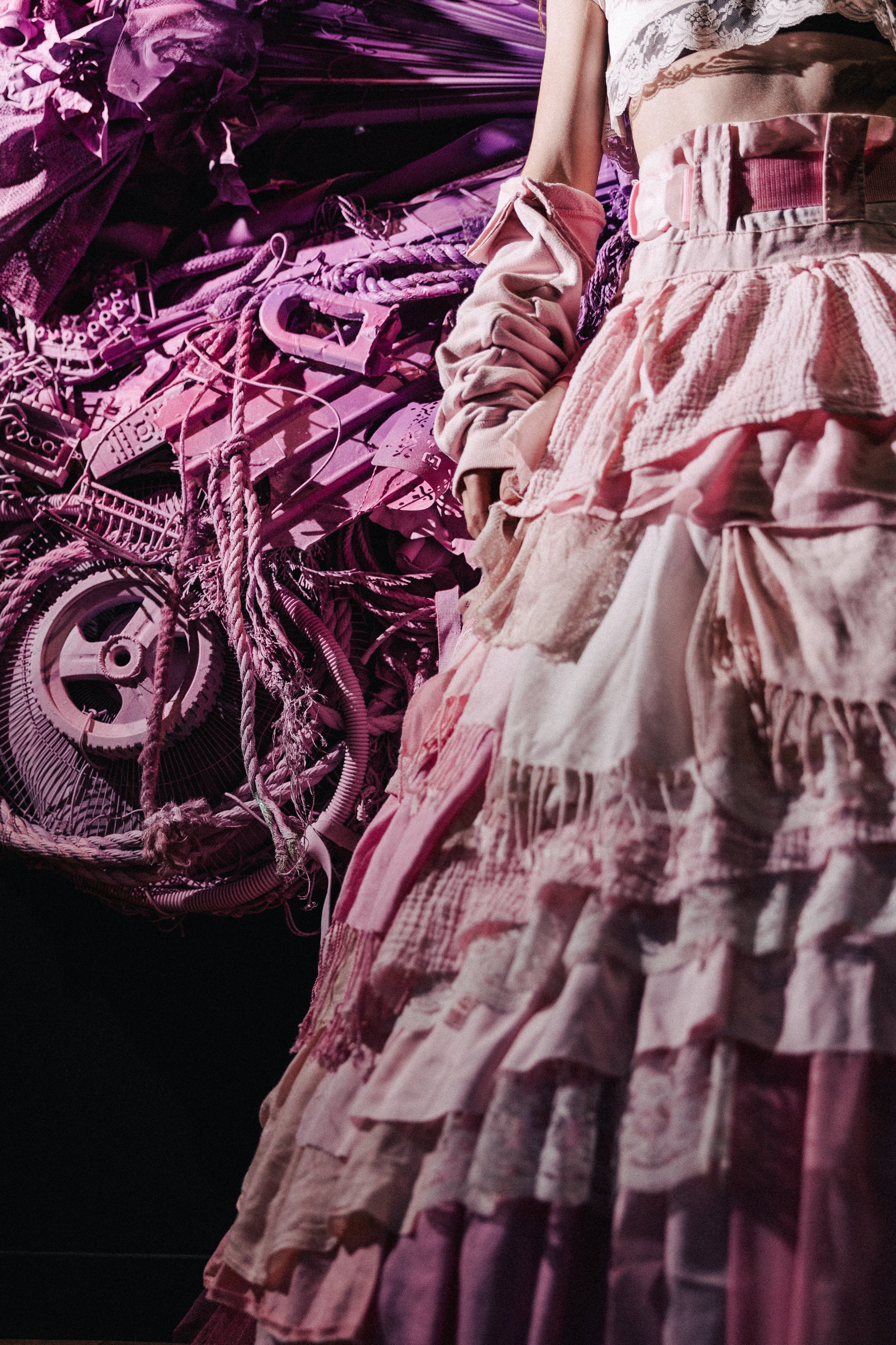 The centrepiece of the collection: The ballgown skirt made from upcycled fabrics. the waiste line made from repurposed curtain material, the liner and lace details from a reworked 1970s vintage lace wedding gown. The body of the skirt is constructed from overlapping layers of repurposed fabric scraps including repurposed pashmina scarves, satin, cotton-linen blends, and other unexpected textiles, creating a patchwork effect in soft pinks. Top made from lightweight silk slip fabric with lace detail. Matching slouchy arm cuffs made from repurposed heavyweight cotton fleece. A one-of-a-kind masterpiece and a true celebration of sustainability and craftsmanship.