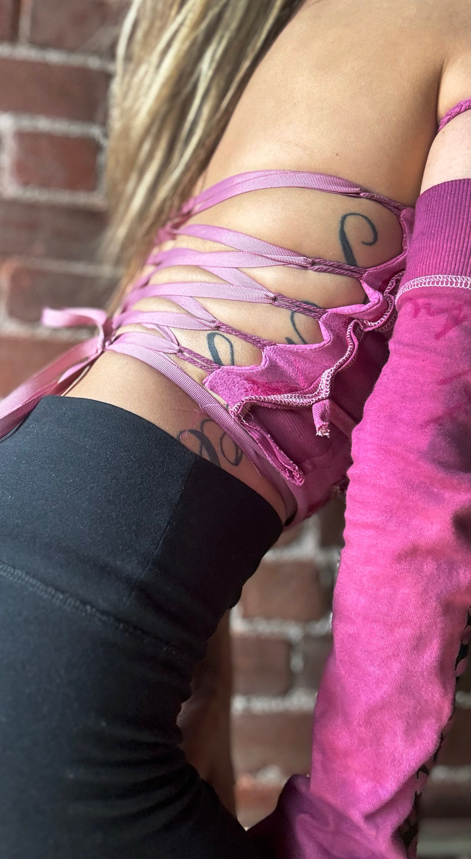 Corset constructed from upcycled heavyweight cotton and cotton canvas utility vest. Hand-dyed and painted with acrylic. Lace-up back for adjustable fit. Includes a one-of-a-kind H-D saem cuff accessory.