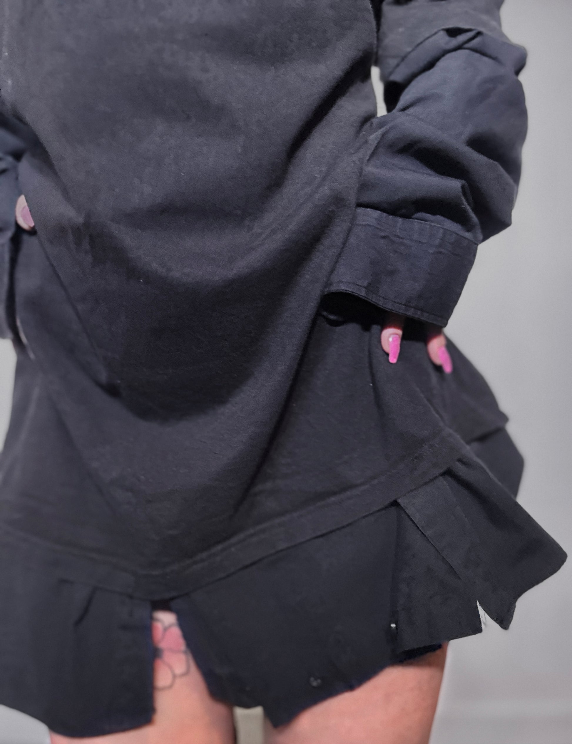 All items are sold as is, handmade from repurposed materials. Not intended for heavy or everyday wear. Gentle spot cleaning recommended. Due to the nature of the materials and construction, items may feature intentional raw edges, visible stitching, or unfinished seams that reflect the character of the art. Wear and aging over time are natural and part of the garment’s evolving story.